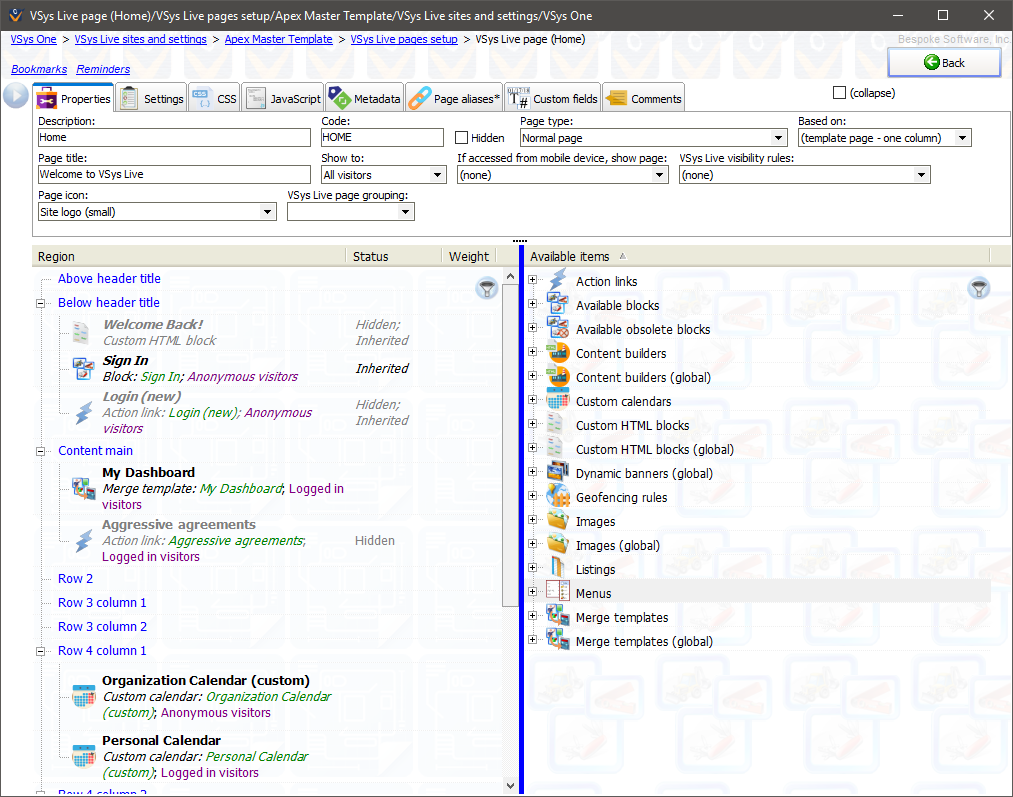 All of the items that came from "(template page - one column)" show in italics, and have a status of Inherited. This means that we can’t delete or edit them, but we can hide them from this page by right-clicking on the item and selecting Hide.