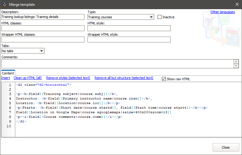 In this example, we've made a merge template for displaying detailed information about a training course: