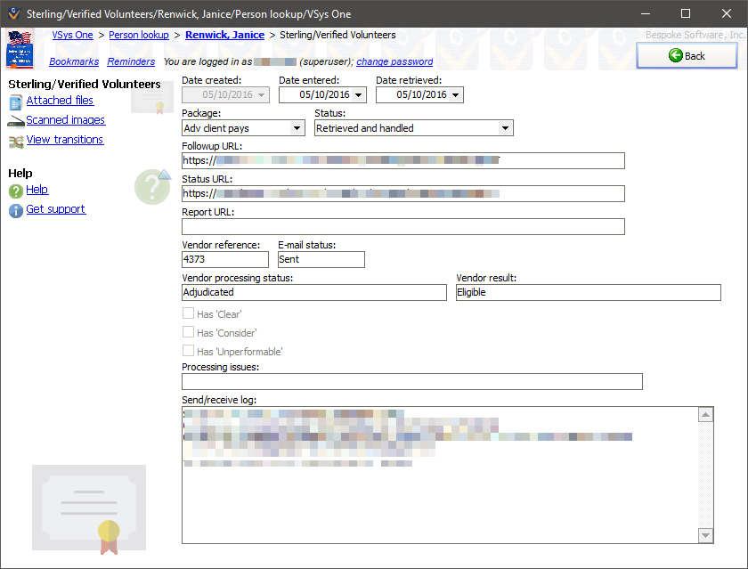See Also Sterling/Verified Volunteers Setting Up Sterling/Verified Volunteers Entering Sterling/Verified Volunteers Background Check Requests Sending Sterling/Verified Volunteers Background Check Requests for Processing Retrieving Sterling/Verified Volunteers Background Check Results Sterling/Verified Volunteers Processing Notes Verified Volunteers Applicant Experience Sterling/Verified Volunteers Automatic Adjudication Statuses Request Results Handling Sterling/Verified Volunteers Preferred Configuration |