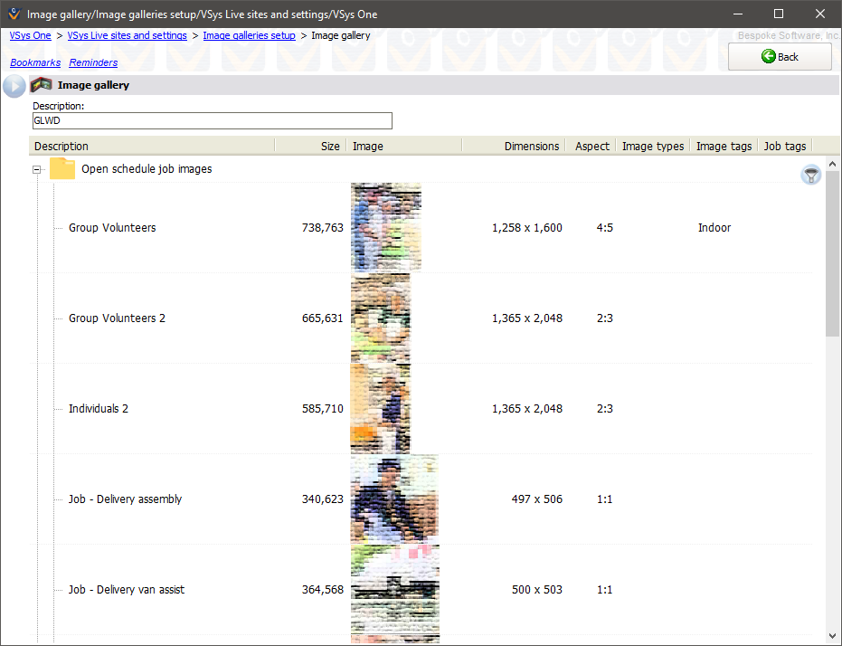 Note that galleries created within a site cannot be directly used with jobs, locations, etc. Jobs, locations, and others can get images from site-specific galleries automatically by matching those images on tags and types, but not by directly adding them to the job/location/etc.