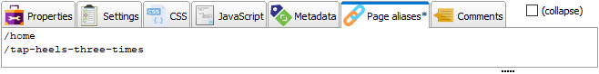 Adding page aliases here makes this page accessible using a path other than the default path. For example, the page "HOME" is normally accessed using /pages/HOME. If you add the page aliases "/HOME" and "/SOMETHING/ELSE", site visitors who use those URLs will get this page as well. To use page aliases, they must first be enabled.