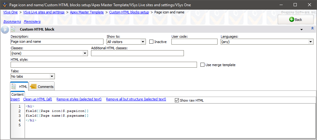In the example below, we've added the block "Page-specific (local) content" to a template page. When a page based on this template page is shown, the icon, name and custom field be replaced with the values from the actual page. This lets us have a whole series of pages that display the same way, but don't have to be set up individually. And if a page's values are changed, e.g. you change the icon, you don't need to change anything else: the next time VSys Live displays the page to a site visitor, it will use the new icon immediately.