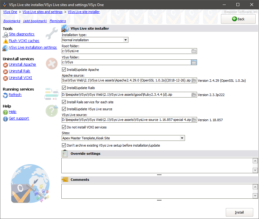 Under normal circumstances you'll choose "Normal installation". Use "VSys Live source code only" to update only the Ruby code that underlies VSys Live without installing or changing Apache or the Rails installation. |