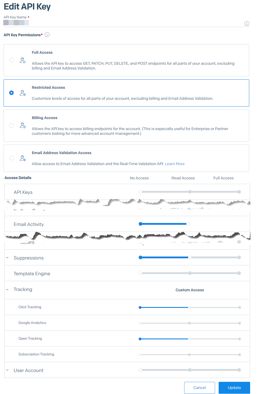 The SendGrid API key must have the permissions "Email Activity", "Suppressions", "Tracking -> Open tracking" and "Tracking -> Open Tracking".