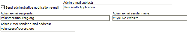 VSys Live can optionally generate an e-mail to your staff once the application is received. To do this, check Send administrative notification e-mail.