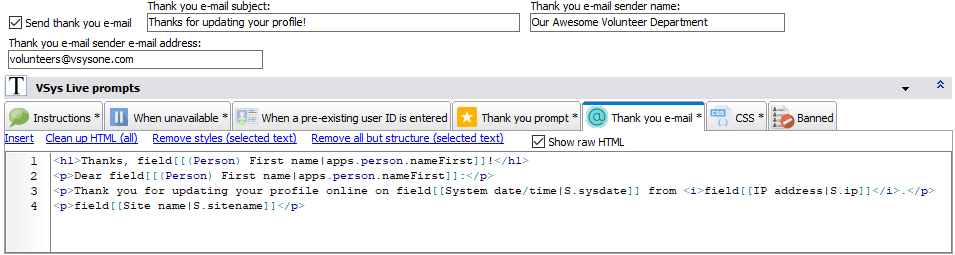 VSys Live can optionally generate an e-mail to the applicant once the application is received. To do this, check Send thank you e-mail.