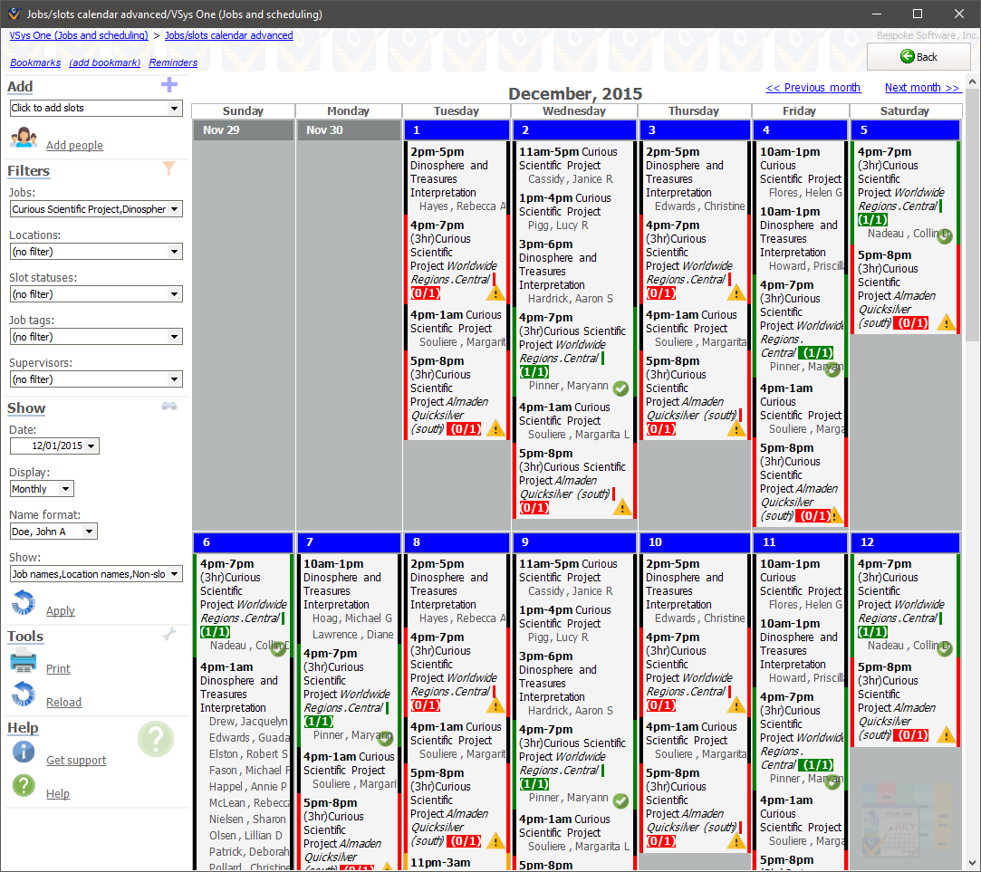 Display changes whether you see a month or a week at time. (If you've chosen Monthly, within Show there's the checkbox Slots/assignments from other months. Check that and in the example above you'll see slots and assignments for the 29th and 30th of November, even though they're not in the current month.)
