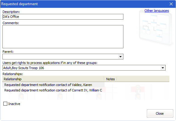 In the example above, two people are designated as "Requested department notification contact". A notification subscription based on "notification relationship", triggered for an application with a Requested department of "DA's office", would be sent to these two people.