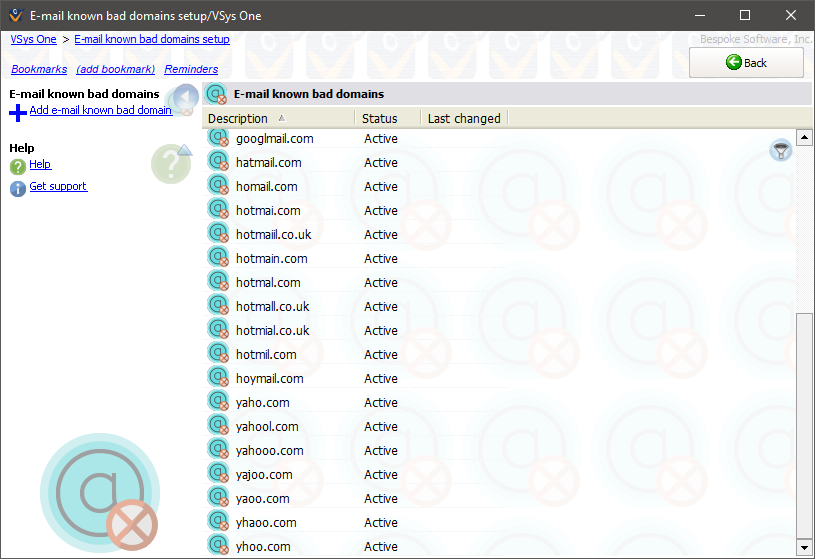 VSys One comes with a list of e-mail domains that it "knows" are bogus: ".cmo", "gmaill.com", "gmal.com", etc. These are usually common typos for manually entered e-mail addresses. From the Letters/e-mails panel, click on E-mail known bad domains. Here you can edit the existing domains or add new ones of your own.