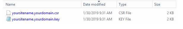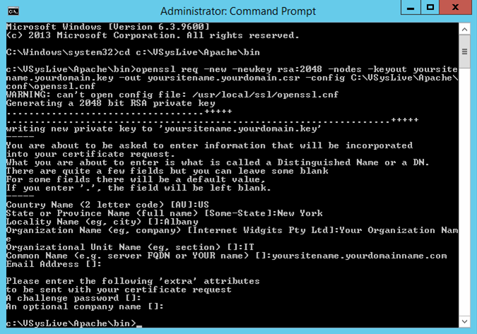 c:\VSysLive\Apache\bin.openssl req -new -newkey rsa:2048 -nodes -keyout yoursitename.yourdomain.key -out yoursitename.yourdomain.csr -config c:\VSysLive\Apache\conf\openssl.cnfyoursitename.yourdomain is your site's name, e.g. volunteers.vsysone.com, and referencing the folder where OpenSSL's .cnf file is located.