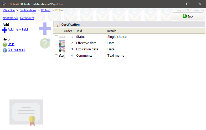 The certification designer lets you add, edit and remove fields from the certification's definition. VSys lets you have an unlimited number of fields on each certification, only requiring that each field have its own unique code. Click the Edit layout/design link to change the fields in a certification.