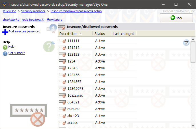 Passwords defined here cannot be assigned to VSys Security users. They optionally can also be disallowed by VSys Live users.