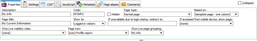 The example below is for a non-template page; a template page has far fewer properties here because it's never used by itself in the real world, it's only used as the basis for other pages.