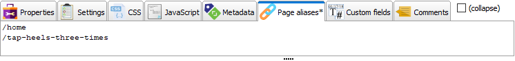 https://demo.vsyslive.com/pages/home (based on the page's Code)https://demo.vsyslive.com/home (the first page alias)https://demo.vsyslive.com/tap-heels-three-times (the second page alias)To use page aliases, they must first be enabled.