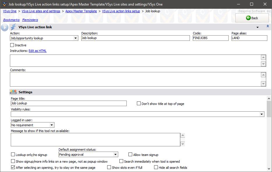 Within a VSys Live site, click on Action links to define them. What you create here combines the action, for example "Job/opportunity lookup", with settings for that action. And there are a lot of settings. Most of them should be intuitive; for the rest, VSys usually comes with a series of built-in action links.