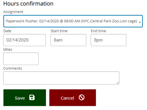Lets volunteers select from a list of recent, past assignments and take credit (get hours) for them.