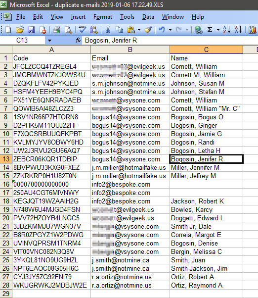 The Find duplicate e-mail addresses tool is a simple one: it generates an Excel file with all of the e-mail addresses that are held in common by more than one person.