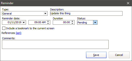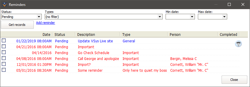 Self-reminders are, as the name implies, reminders to yourself. Think of them as "to-do" lists. A self-reminder can be associated with a person, or they can be standalone. Self-reminders are not automatically generated by VSys: you make these for yourself.
