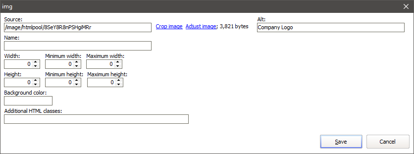 Depending on the HTML element that you have focused, opens up a dialog (below) to easily edit the various attributes of that element. |