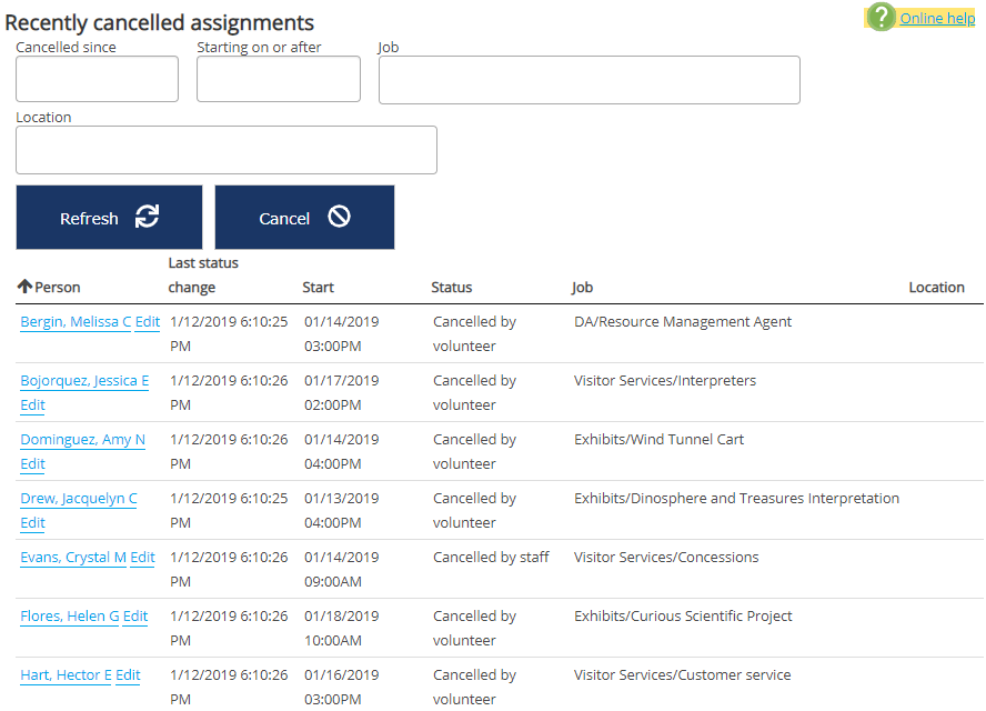 The Recently Cancelled Assignments tool here works just like its VSys One equivalent, showing you training records with a Status of "Cancelled by volunteer" or "Cancelled by staff" during some time period. Use the filters at the top to select the cancellation date range, start date, jobs, etc. Then click Refresh to load th assignments.