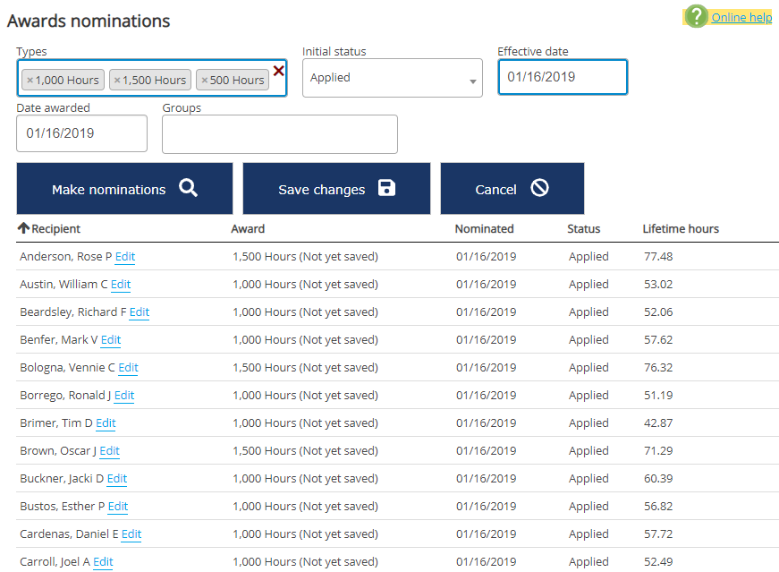 Open Awards nominations, select the appropriate Types, Initial status, Effective date and Date awarded. Note only hours up to and on the effective date are included in the calculations. (Making these nominations doesn't save them - you'll get to preview them first.)