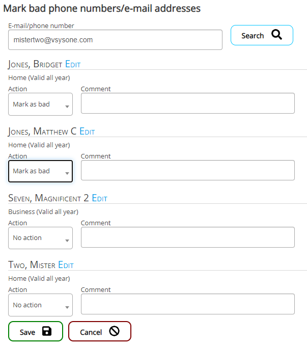 For each person brought up (if any), choose an Action: "Mark as bad" will mark that e-mail address or phone number as "Known bad" in their profile, then optionally add a comment to their profile. "No action" tells VSys to ignore this person, effectively saying that the e-mail address or phone number is fine for this person.