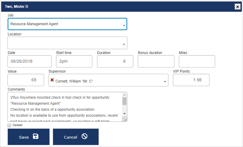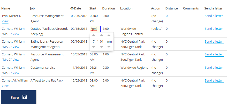 Inline editing: You'll edit assignments by clicking directly on them in the listing (you can change the Date, Start, Duration, delete the assignment, Distance and Comments). You have to click Save at the bottom for any of your changes to take effect.