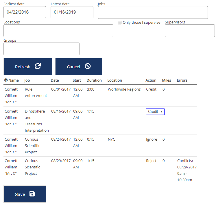 The Hours Approval (Advanced) tool is used to approve (and possibly edit) or reject volunteer self-entered hours. Note that hours created as a result of checking in and out of assignments or trainings never require approval, this is only for hours entered by the volunteer after the fact.