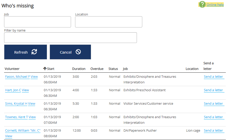 Use the filters at the top to search by Job, Location, and the person's name, then click Refresh. For each record it shows when they should have been here, the length of their assignment and how late they currently are.