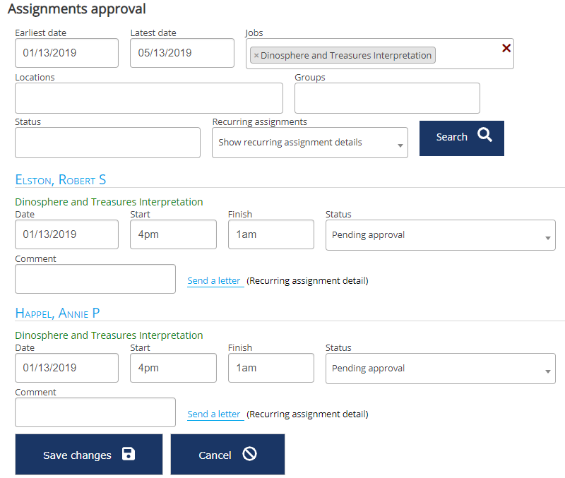 The Assignments Approval tool gives you a quick listing of job assignments by date and status. Its primary purpose is to let you find assignments to approve, cancel or reject, especially for assignments which have been self-selected using VSys Live.