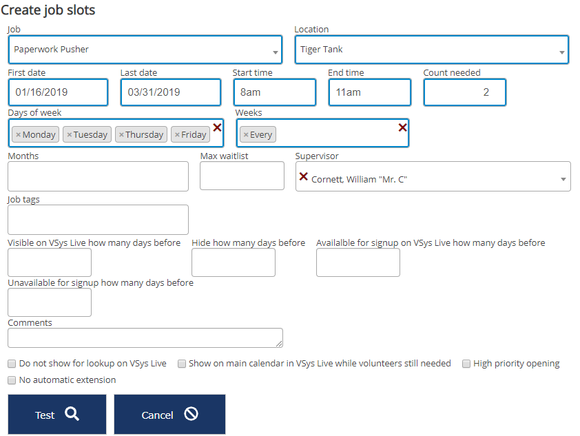 First select a Job, then assign the other properties of the slot to be created; these are the same as are used in slots elsewhere in VSys.