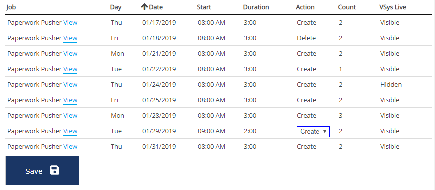 If they are mostly accurate, edit the slots by clicking on the grid. You can change their Date, Duration, Action ("Create" or "Delete"), Count, or whether they're visible on VSys Live.