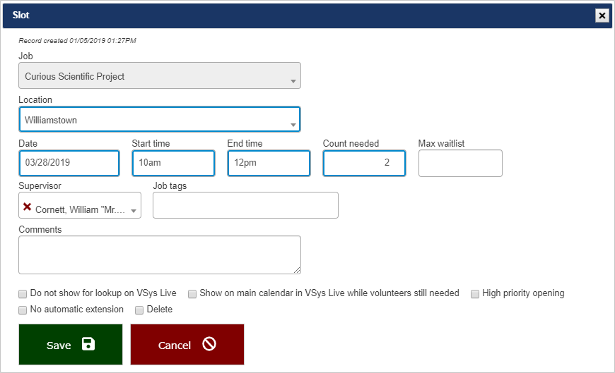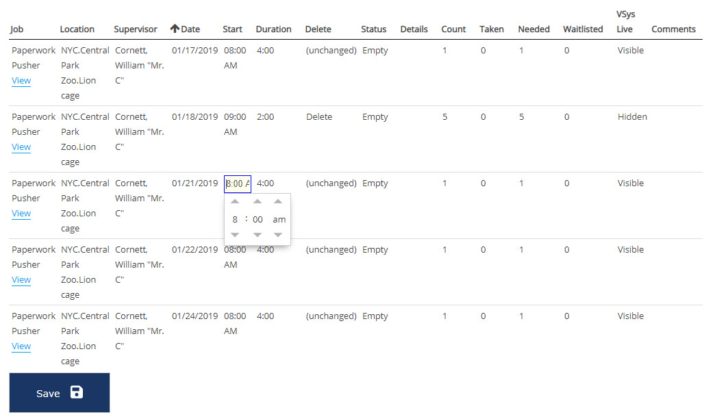 Inline editing: You'll edit slots by clicking directly on them in the listing (you can change the Date, Start, Duration, delete the slot, Count, and whether it's visible in VSys Live). You have to click Save at the bottom for any of your changes to take effect.