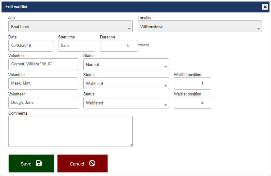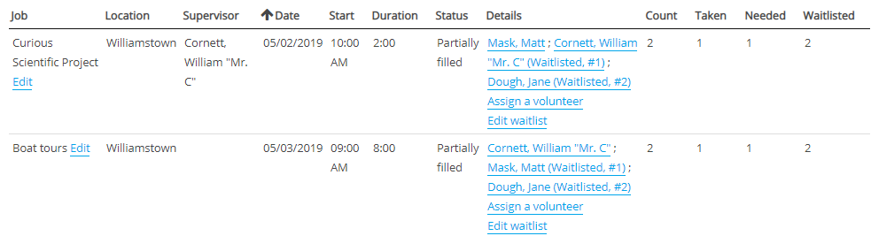 For slots with one or more waitlisted volunteers, VSys will list those waitlisted volunteers in order and include the Edit waitlist link.