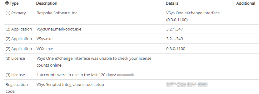 The VSys Anywhere Check Licensing tool is the equivalent of the VSys One License information tool. VSys Anywhere lists the tools currently installed, their versions, and a list of all of your licensed products with registration codes.
