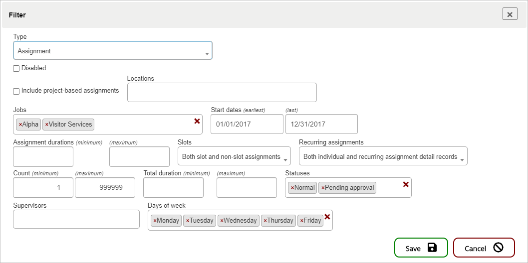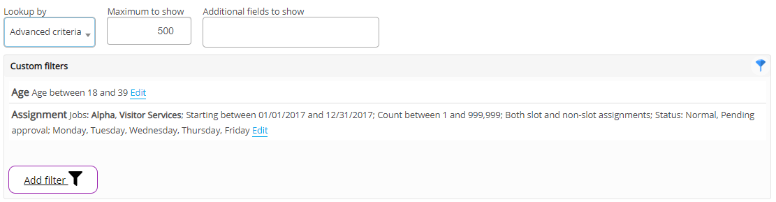 Allows you to use detailed filters rather than just the basics. Note that if two or more criteria are added, a person must meet all of them to be shown. |