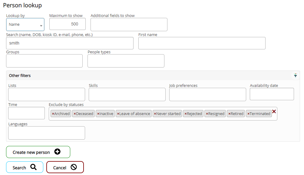 This is the most common lookup method, and "Name" is deceptive: you can search by name, DOB, Kiosk ID, e-mail address, phone number, and other fields all at once. The Search field is required, but all others such as First name, Groups, Job preferences, etc. are optional. (In most cases you'd only show some of these fields anyway.) |