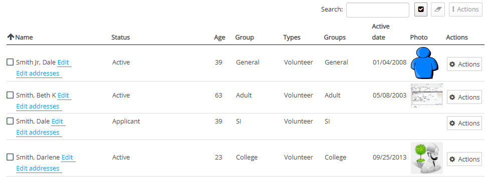 Shown are the columns that were chosen earlier, plus the actions available for each person.