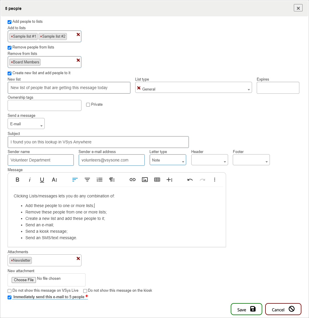 When sending an e-mail you can include any number of pre-created attachments and/or create a new attachment right here. Note that that new attachment will be given an expiration date of today so that it doesn't clutter up the list of e-mail attachments. None of the messages here supports letter templates, in other words everyone selected gets exactly the same e-mail, kiosk message or SMS/text message.
