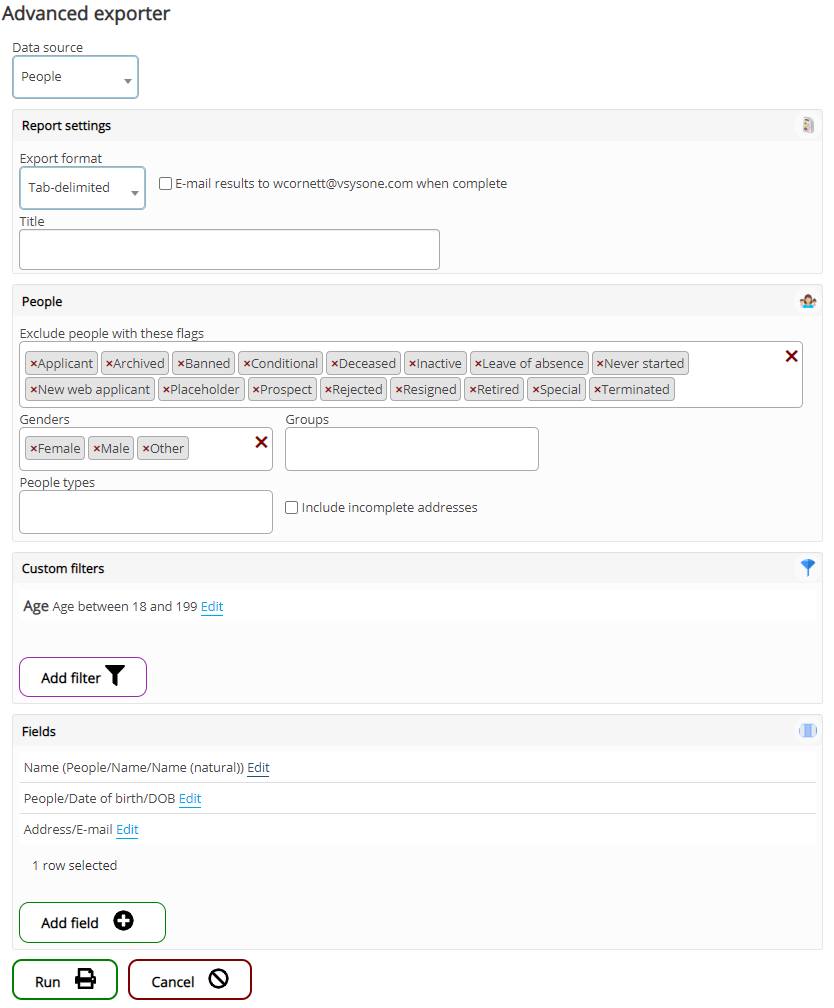 If checked, when the export is run, it will be e-mailed to the person who ran it. |