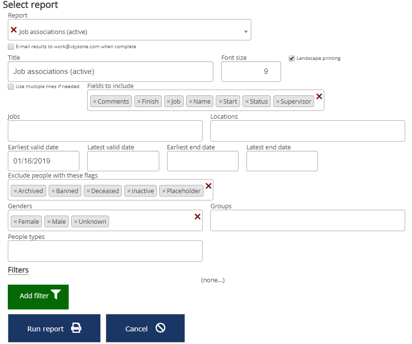 The fields, filters and options will vary widely depending on the report that you selected. Make any changes as appropriate.