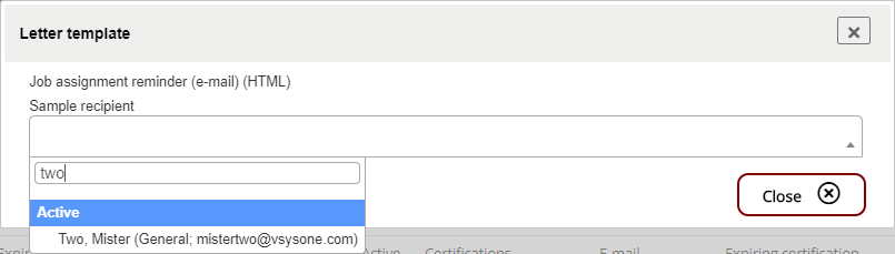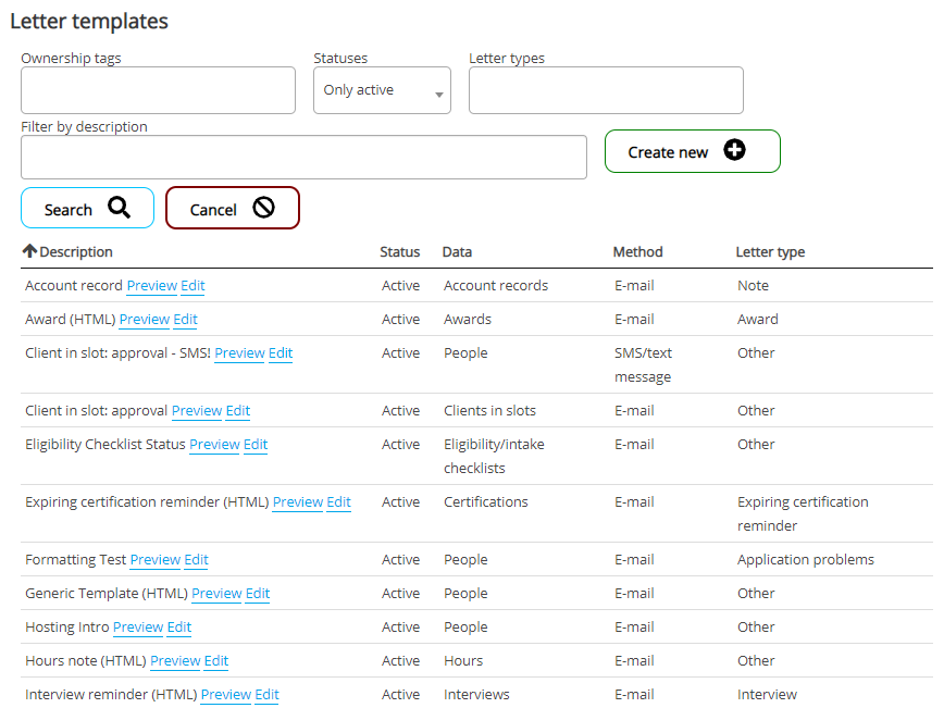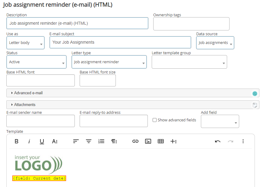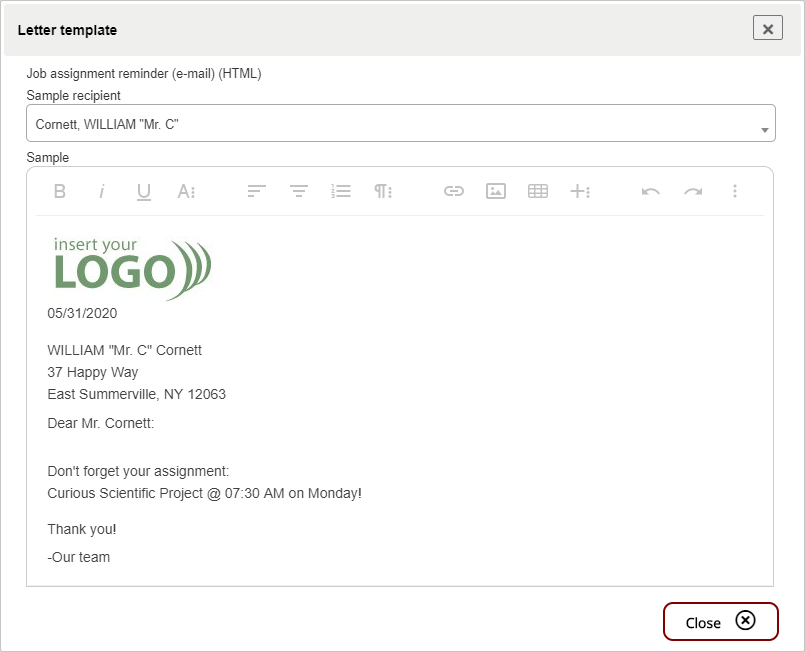 Letters can be associated with any of several types of data including: People, Mandates, Trainings, Certifications, Awards, Interviews, Account records, Assignments, Application forms, Credentials (name tags), Incoming messages, Letters and hours. For example, letters based on interviews can be used to send notices about interviews in the Interview manager and make it easy to include information about a single interview in the letter. Other data types work similarly in the appropriate places. To be used for assignment reminders, a letter template's Data source must be Assignments. To be used for training reminders it must be set to Trainings. |