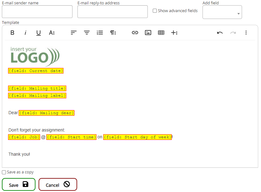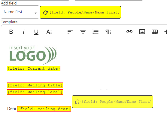 Letter templates are the documents or messages which VSys merges together with information about your people to produce letters. They are identical in concept to mail merge documents in Microsoft Word. Write your letter and include data fields. The data fields are then replaced with each volunteer's information to create the individual letters.