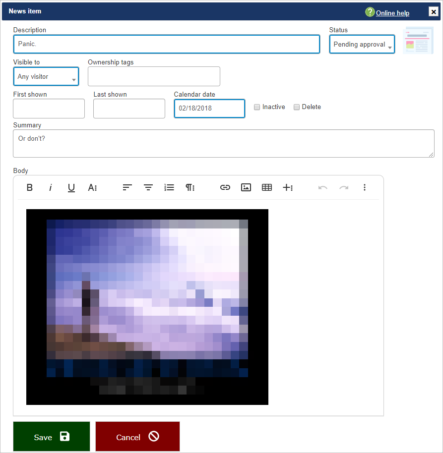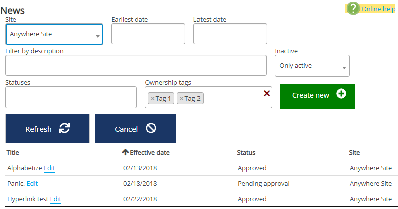 - Select a Site to work with the news items for that site; remember that news is site-specific.
