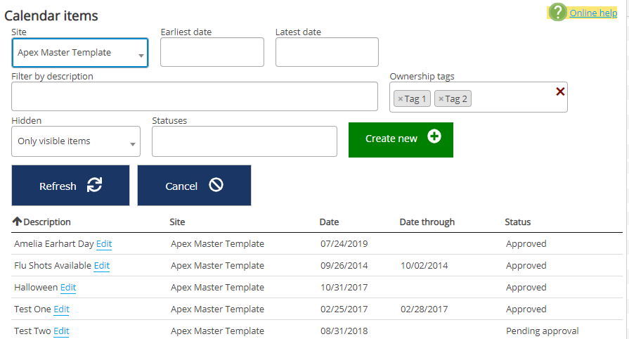 Select a Site to work with the calendar items for that site; remember that calendar items are site-specific.
