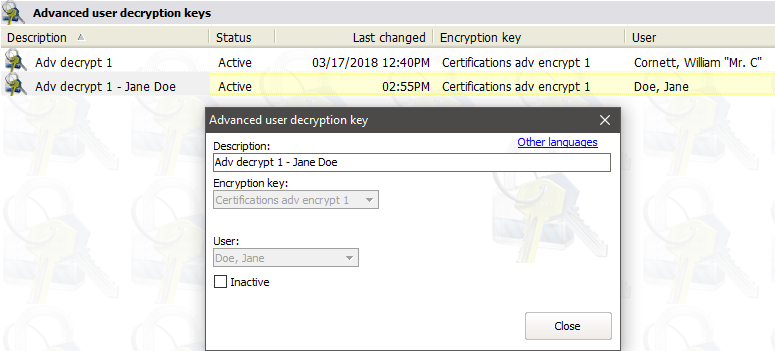 Click on an existing user key to modify it. Note that you can only change the Description and Inactive properties- not the Encryption key or User at this point. Disable a key by marking it Inactive and saving it.