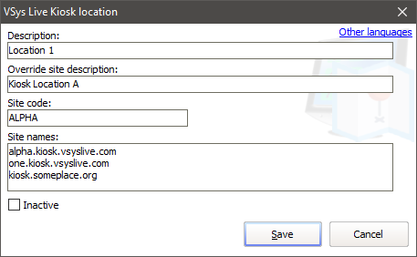 A single VSys Live Kiosk site can have multiple aliases assigned; e.g. kiosk.vsyslive.com, kiosk1.vsyslive.com, kiosk2.vsyslive.com. These different URLs all load the same VSys Live Kiosk site using Apache virtual hosts, but become, by virtue of being used with these names, seen as being at a specific location. |