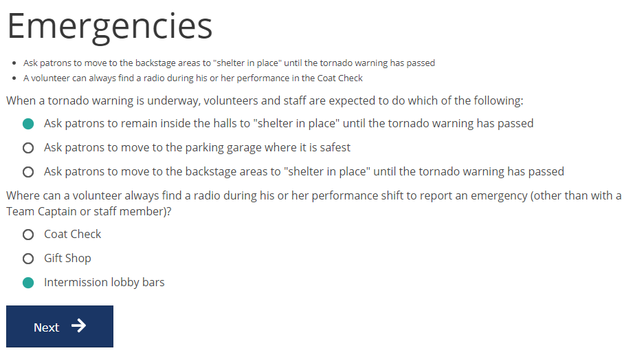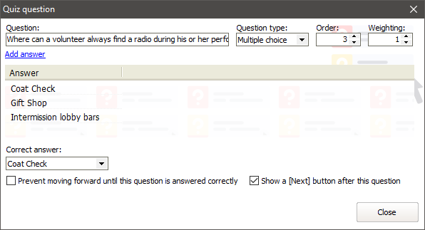 If checked, the training will "stall" and prevent the volunteer continuing until the correct answer is given (only valid for Multiple choice questions). Use this when you're less worried about them remembering the answer and more about them reading the content through to get it right. |
