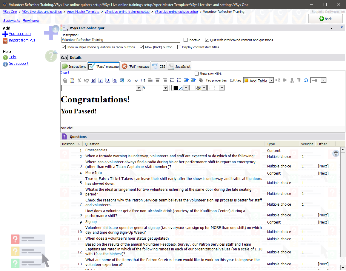 Like regular quizzes, right-click on the list of questions to add/edit/delete or re-order the questions. When adding a question it can be either a question or HTML content.