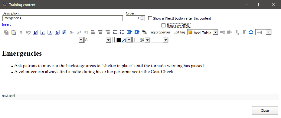 While the HTML editor in VSys (and other HTML editors) renders HTML accurately, "accurately" here does not necessarily mean that it shows here the same way that it will in the actual training in VSys Live. Why? CSS. Your VSys Live site has its own custom CSS which gets applied to all of the content on your site. In addition, viewing the training on different devices (especially mobile ones) can result in seeing something there that's different from what you're intending here. Plan to test the training before you deploy it!